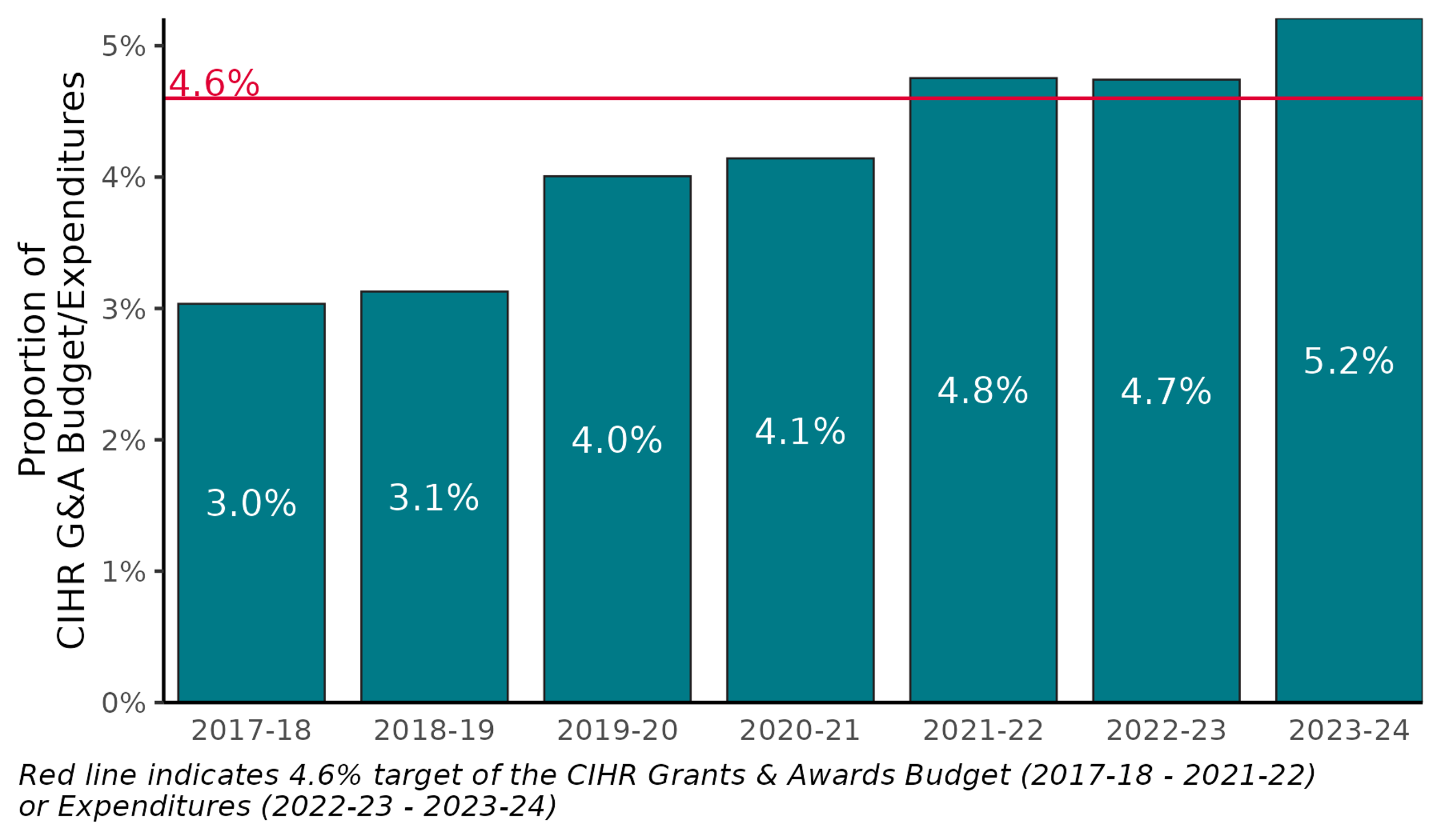 The target of the CIHR Grants & Awards Budget (2017-18 - 2021-2022) or Expenditures (2022-23 - 2023-24) was 4.6%.