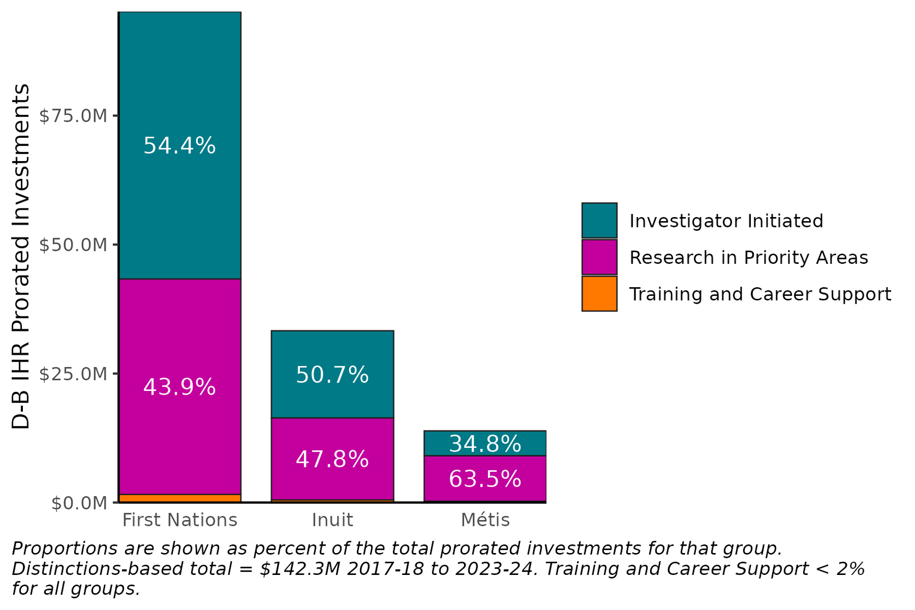 Proportions are a percent of the total prorated investments for that fiscal year. Distinctions-based total = $142.3M. (2017-18 - 2023-24)