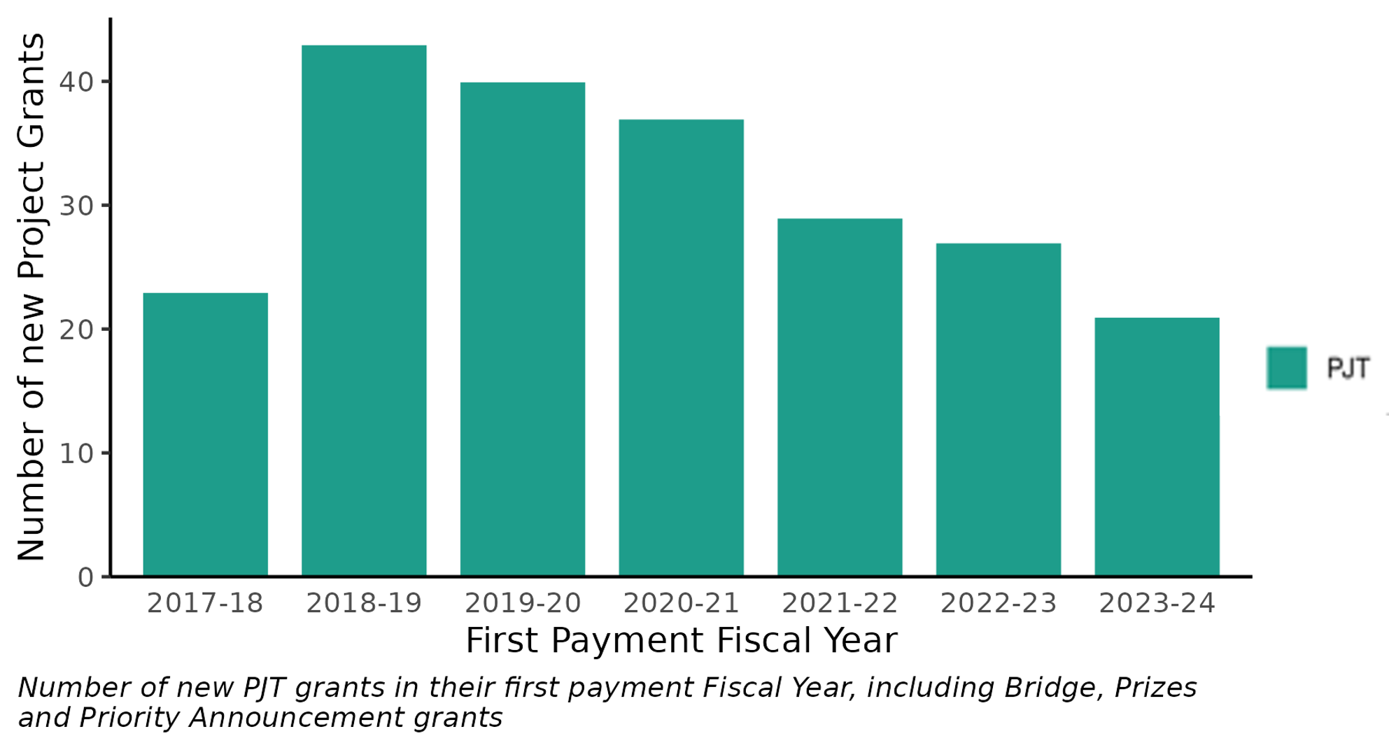 Number of new PJT grants in their first payment Fiscal Year, including Bridge, Prizes, and Priority Announcement grants
