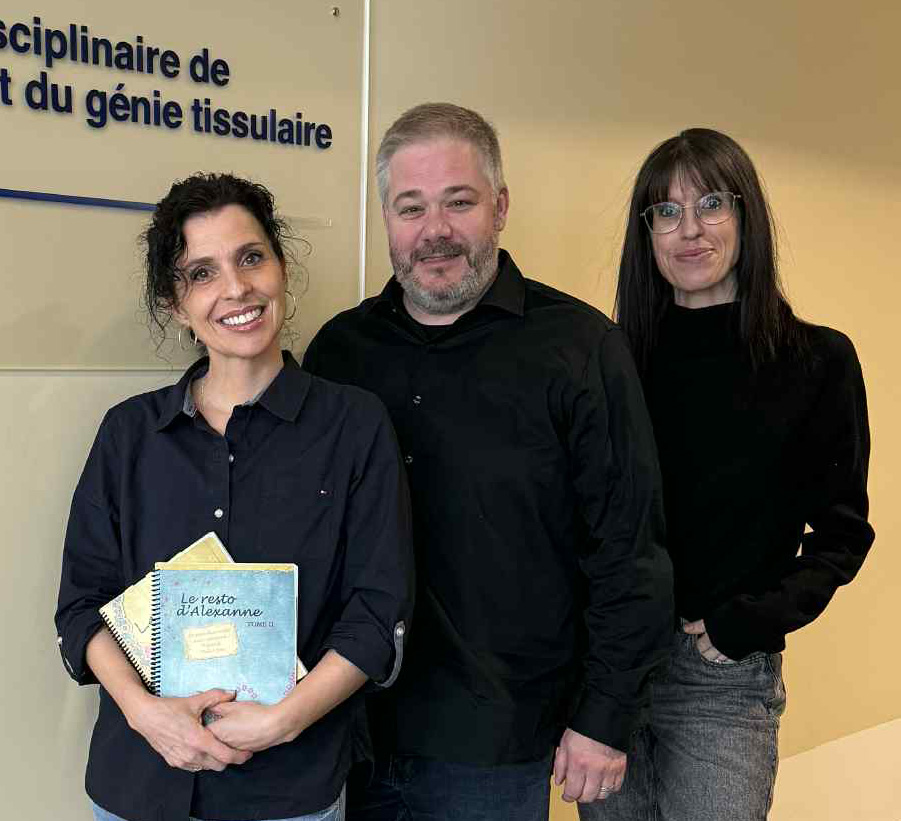 Martine Delisle with the recipe books "Les Restos D'Alexanne", Dr François Gros-Louis, and Gabrielle Labonté, General Manager of ANFQ.