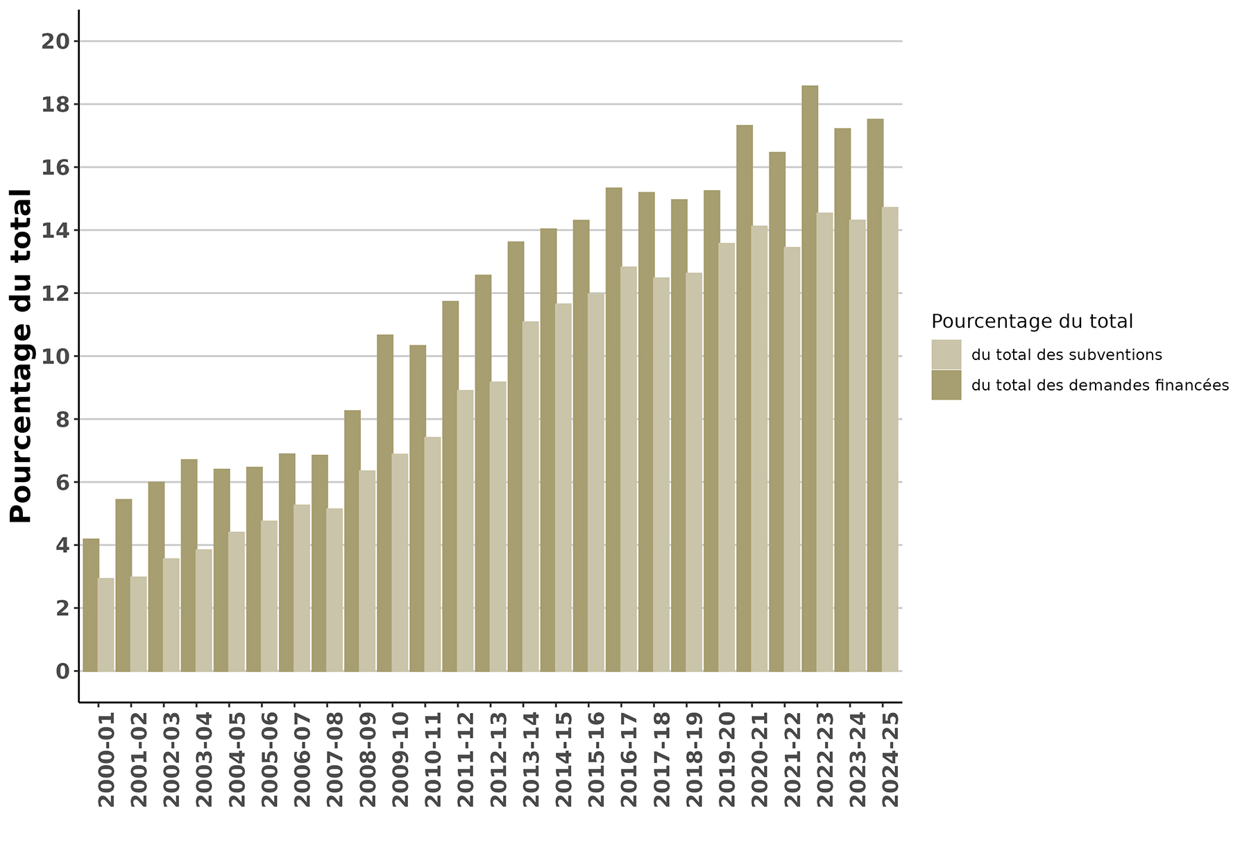 % du total des subventions 2,9 % 3,0 % 3,6 % 3,8 % 4,4 % 4,7 % 5,3 % 5,1 % 6,3 % 6,9 % 7,4 % 8,9 % 9,2 % 11,1 % 11,6 % 12,0 % 12,8 % 12,5 % 12,6 % 13,6 % 14,1 % 13,4 % 14,5 % 14,3 % 14,7 %