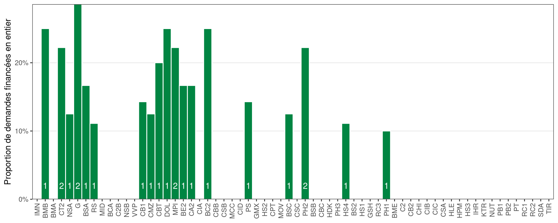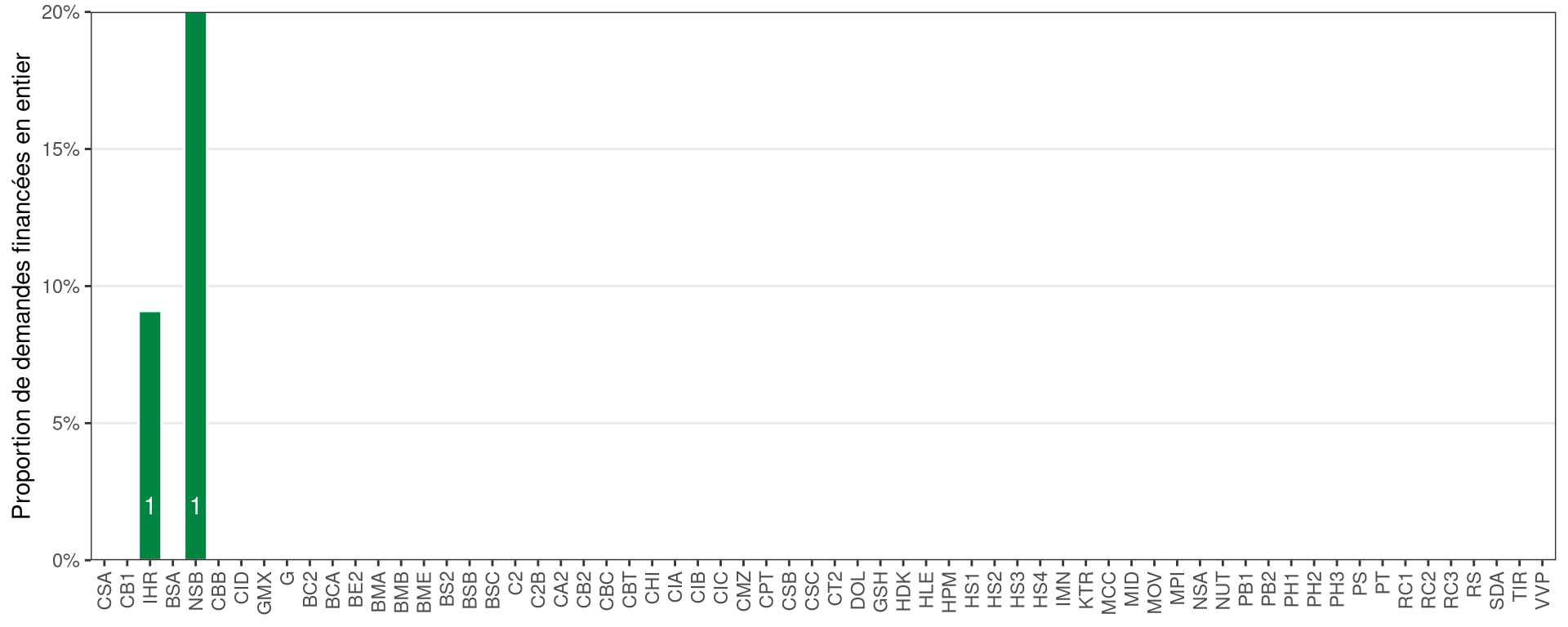 Catégorie | Nombre de demandes soumises | Proportion du total de demandes soumises | Nombre de demandes financées | Pourcentage de demandes financées | Taux de succèsNote en bas de page * | Valeur moyenne des subventions | Valeur maximale des subventions |