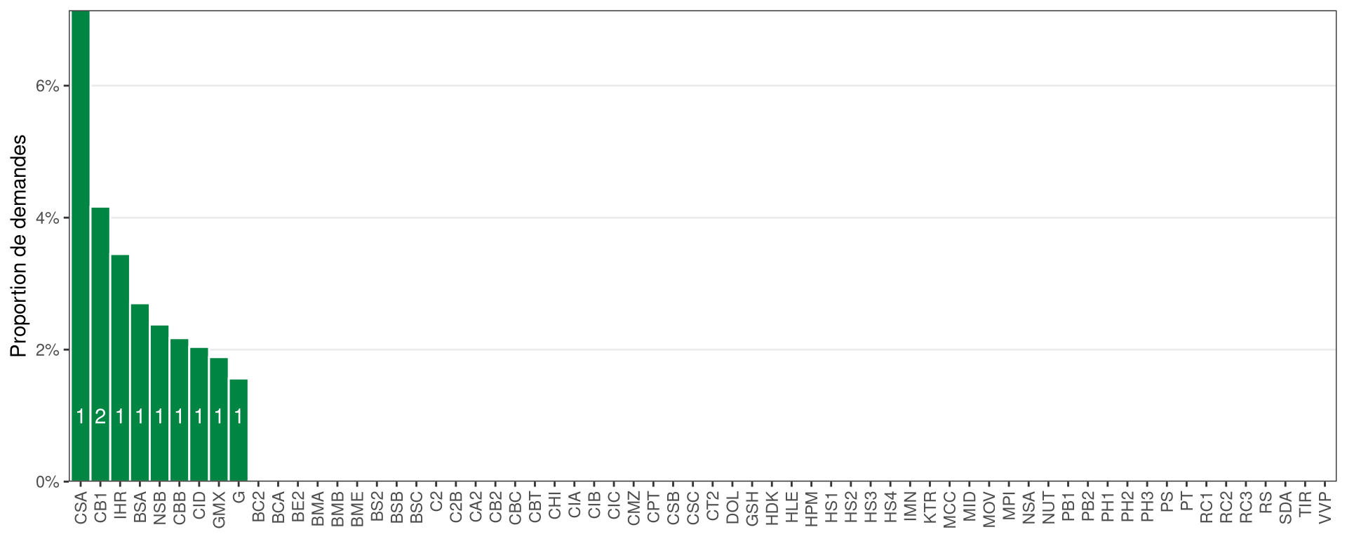 Demandes en français | 60 | 32 | 53,3% | +3,3pp | 28 | 46,7% | -3,3pp |