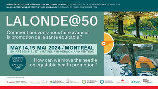 ![]() Conférence Lalonde@50 (en anglais seulement) La séance principale de Lalonde@50 (une conférence coparrainée par l'ISPP) a été présentée par la Dre Kate Frohlich. Elle a retracé le chemin du progrès, du Rapport Lalonde en 1974 aux déterminants structurels de la santé d'aujourd'hui. Elle a suscité en outre des questions invitant à la réflexion quant à la façon dont les facteurs structurels influent sur la santé de la population. Hôte et partenaire de la conférence : Département de l'équité, de l'éthique et des politiques de l'Université McGill |